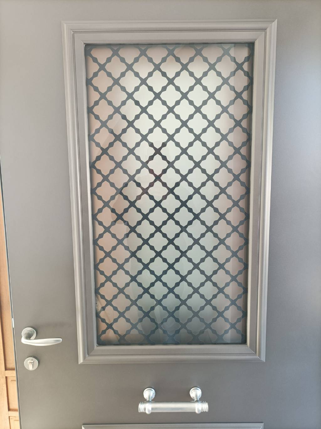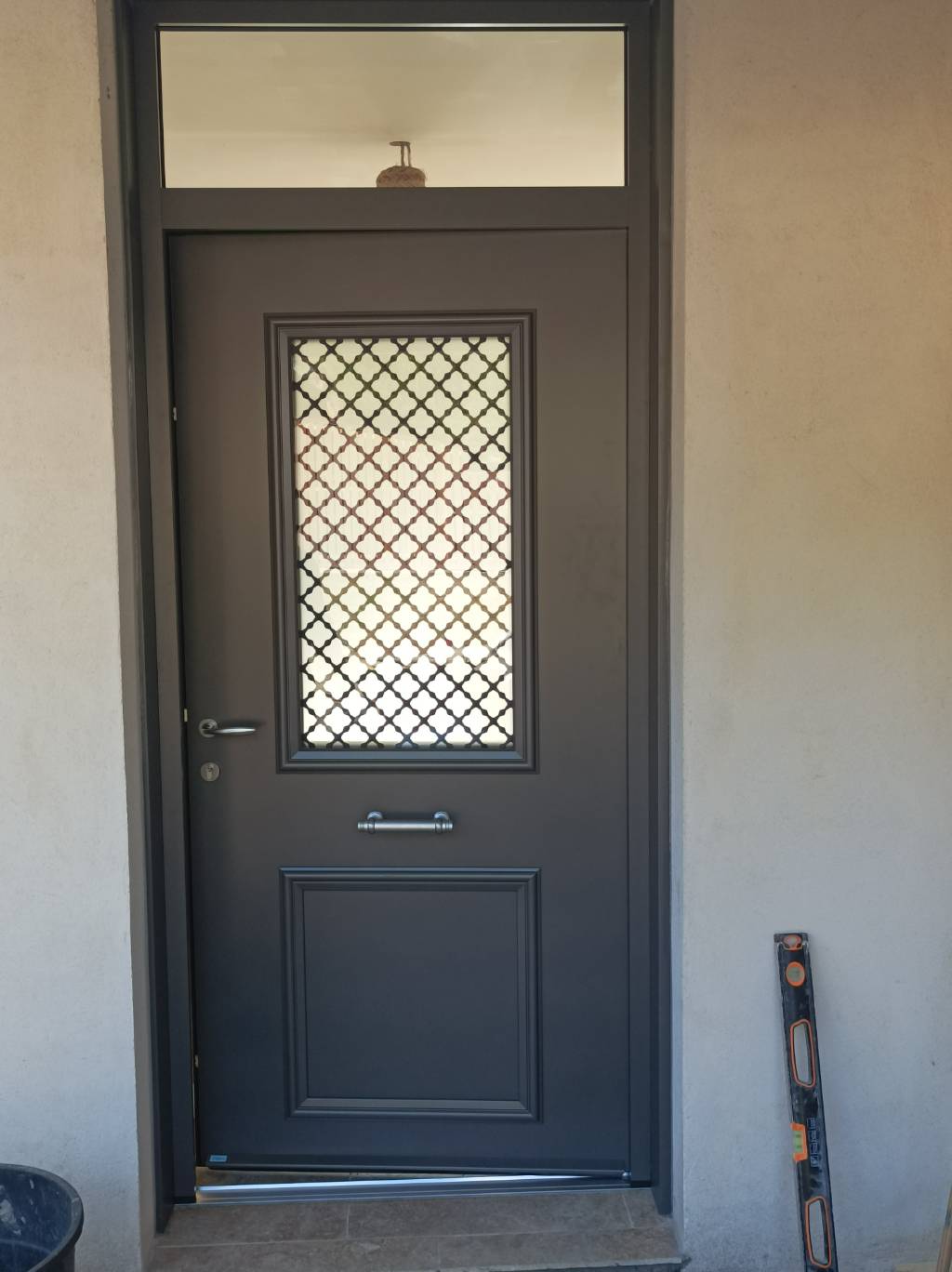 Les clients sont partis sur la porte SEGOVIA 2, coloris RAL GRIS 2900 texturé, vitrage avec sérigraphie gris foncé, une partie imposte fixe vitrée transparent, pour un gain de lumière plus important.