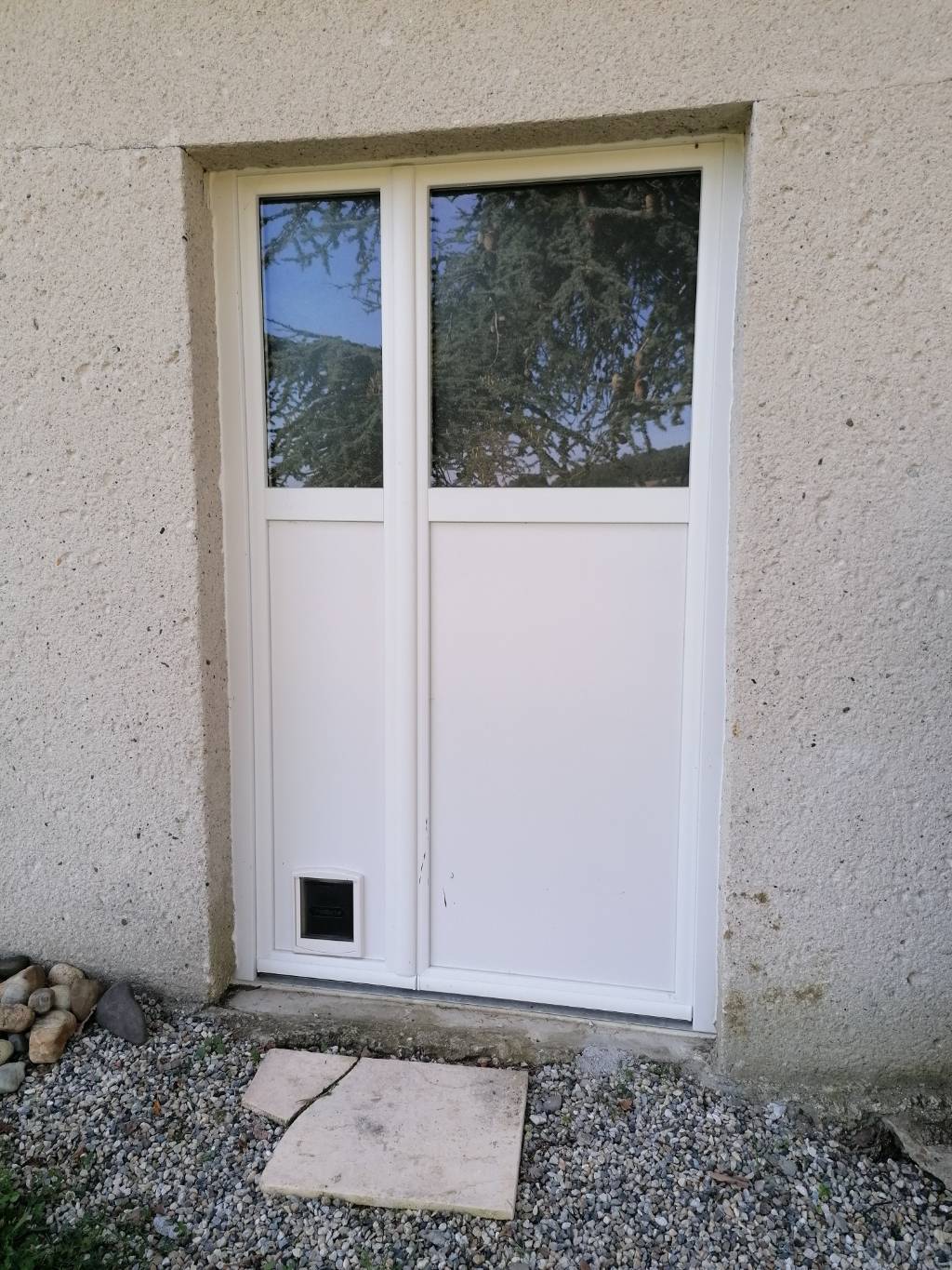 Une fois sur place, notre technicien à fait preuve d'écoute par rapport au besoin de ce client. Son souhait, avoir une porte avec un soubassement haut et une chatière dans celui-ci. Mais pour un côté plus aisé de passage, notre technicien à suggéré au client de partir sur la configuration tiercée afin de faciliter le passage pour l'ouvrant principal.