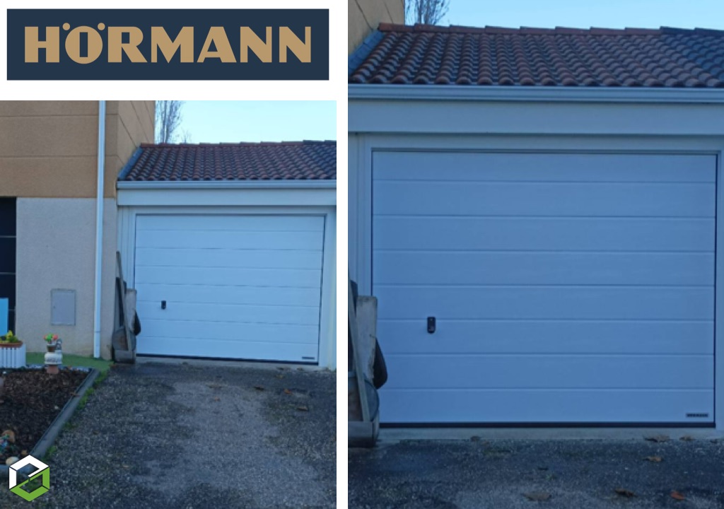 Les travaux consistent à remplacer l’ancienne porte de garage basculante par une porte sectionnelle isolante haute performance, dans le but d’améliorer l’efficacité énergétique du logement, de la marque HORMANN, leader européen de la porte de garage.