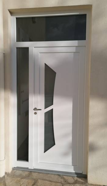 Après consultation de notre catalogue, le client à choisit le modèle MILKY 1 de chez ZYLTEN. Nous sommes passés sur une porte large de 900 de passage et un fixe latéral vitrée. Au vue de la hauteur initiale, il a été préférable de mettre une imposte vitrée également. La porte comporte une fermeture automatique 5 points dont 2 crochets et un seuil alu de 20 mm de hauteur répondant au normes PMR.