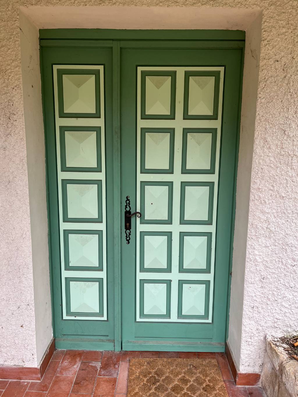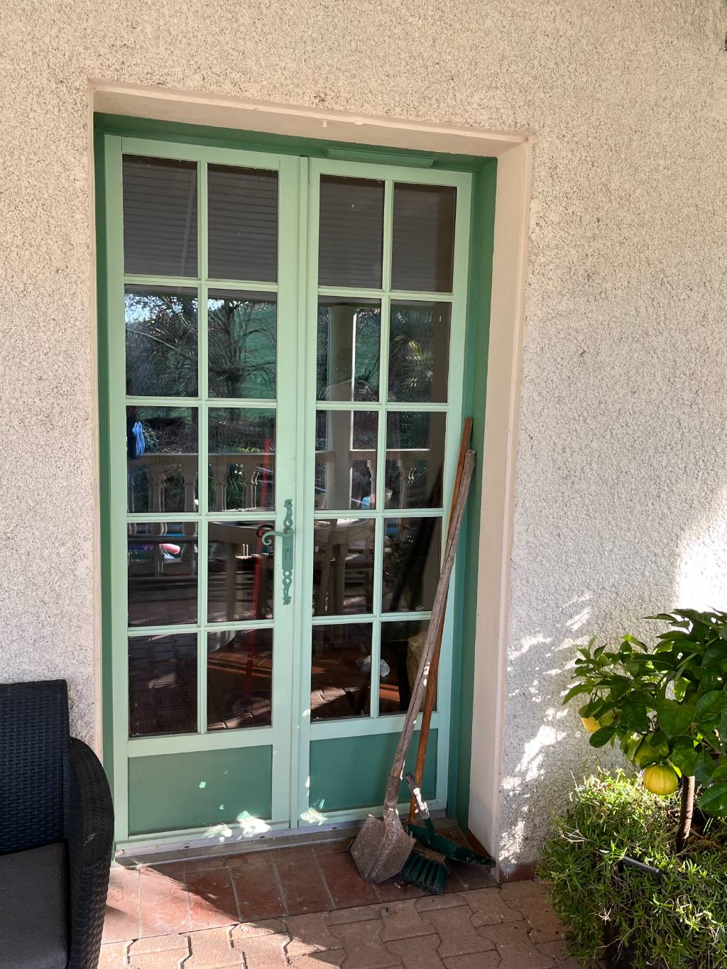 Pour la pièce principale, nous avons installé une porte-fenêtre 2 vantaux avec soubassement de la gamme FP72, fournie par CASTES Industrie. La menuiserie en PVC plaxé Gris 7016 granulé, intérieur et extérieur, comporte un dormant avec aile de 60 mm pour une pose en rénovation propre. Le soubassement en panneau sandwich et le double vitrage 4/20/4 FE Argon assurent isolation et confort thermique. L’ouverture est intérieure droite tirant, avec serrure à barillet et béquilles finition F9. Les cornières 40 x 60 assurent une finition nette et stable.