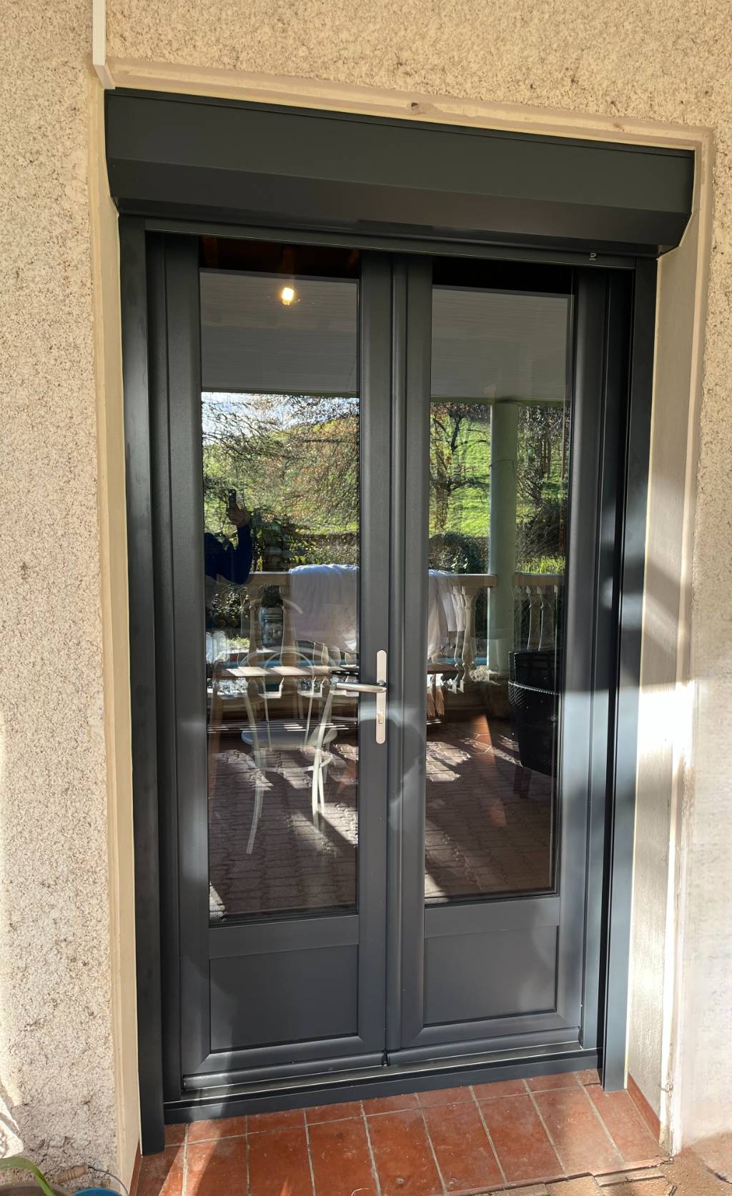 Pose complète : porte d’entrée ALOE, porte-fenêtre 2 vantaux et volet roulant motorisé Somfy