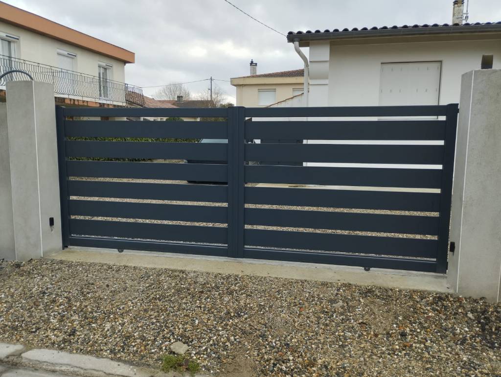 Les montants mesurent 85 x 55 mm et sont fabriqués en acier galvanisé pour assurer solidité et rigidité. Les traverses, de 95 x 35 mm, offrent un support stable et renforcé, tandis que le remplissage est constitué de barreaudages horizontaux de 180 x 20 mm, en aluminium ou acier selon les besoins, assurant ventilation, visibilité et sécurité. Le portail est conçu pour un refoulement à droite (vue de la rue) et s’adapte parfaitement aux piliers existants, sans nécessité de travaux supplémentaires.