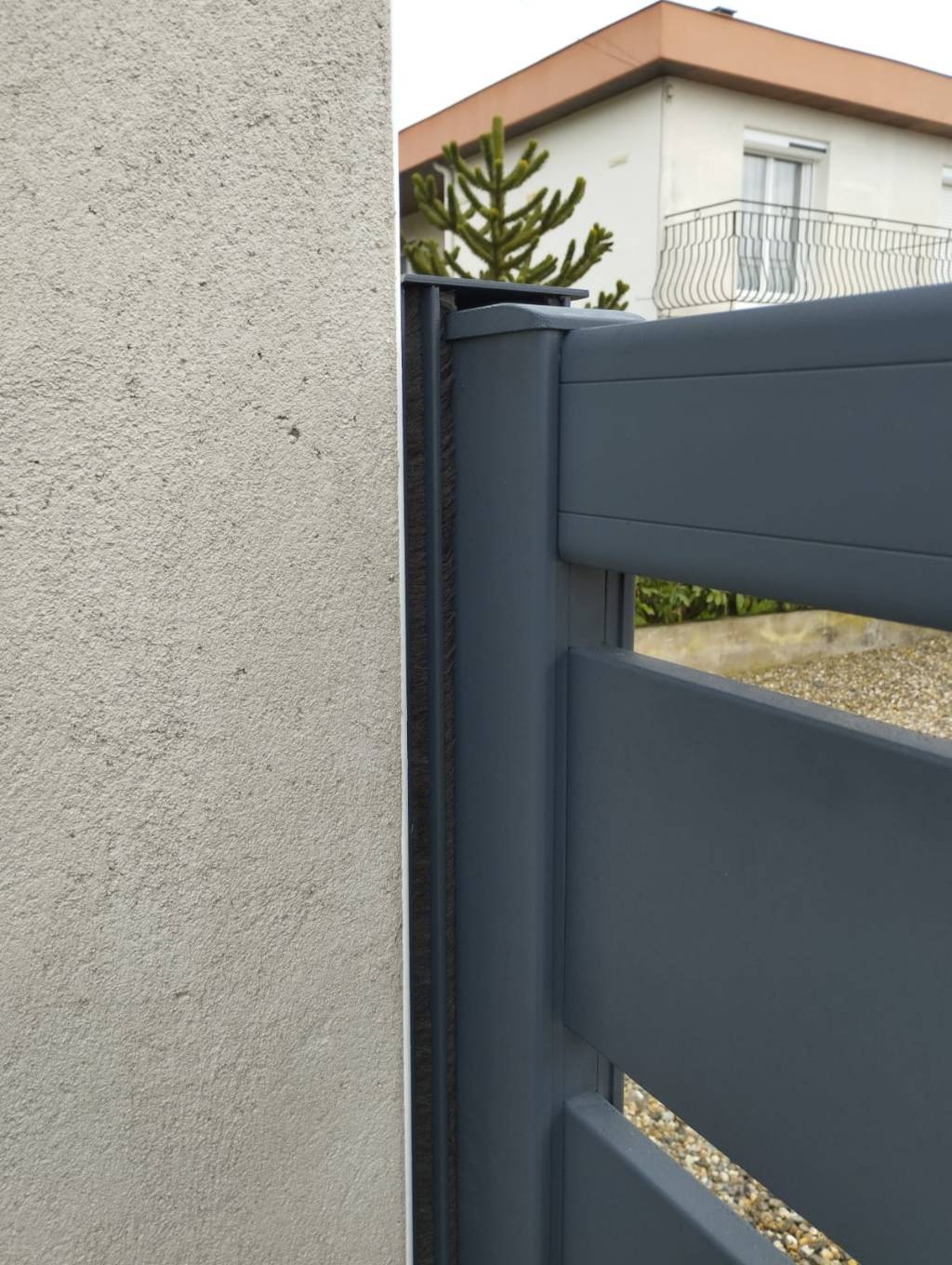 Le portail présente une structure robuste et un design contemporain grâce à sa finition en gris anthracite RAL 7016 à fine texture, résistante aux intempéries et aux rayures. Sa forme droite et son modèle standard avec imitation deux vantaux permettent une intégration harmonieuse dans la configuration existante de l’entrée.