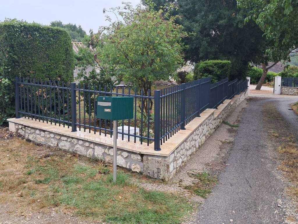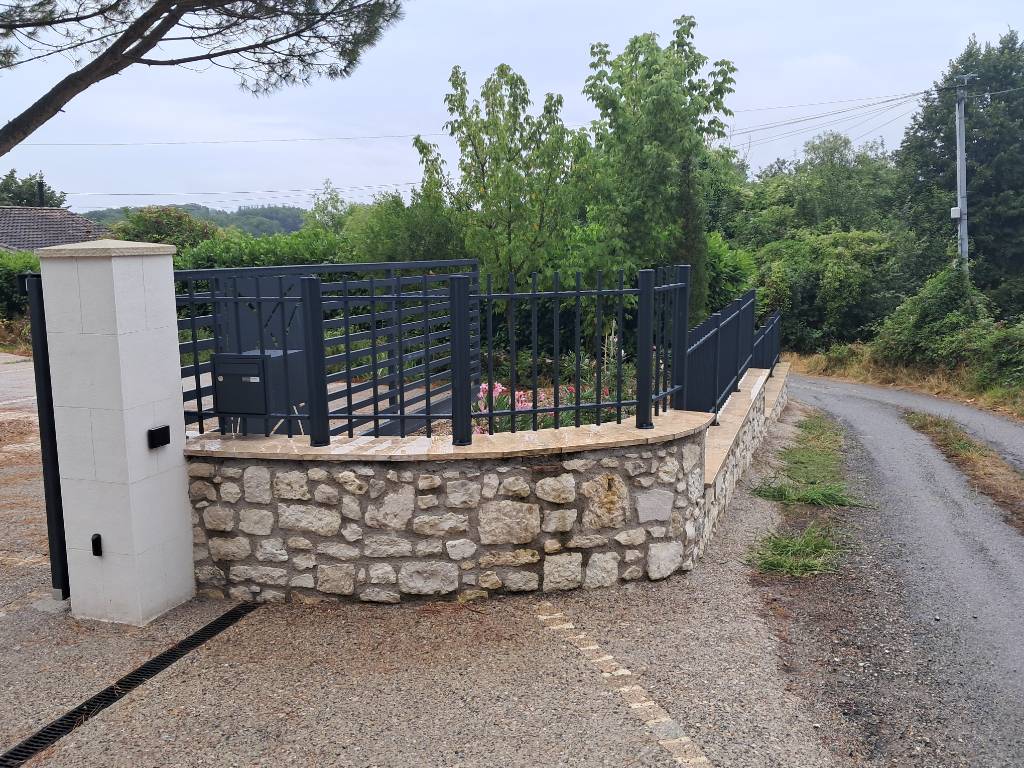 Nous avons installé un portail 2 vantaux égaux, modèle Lignol, de chez Kostum, conçu sur mesure selon une largeur entre piliers et une hauteur hors sol au point haut. Le portail présente un remplissage ajouré avec des barreaudages Moncontour, offrant un rendu moderne tout en conservant la transparence.