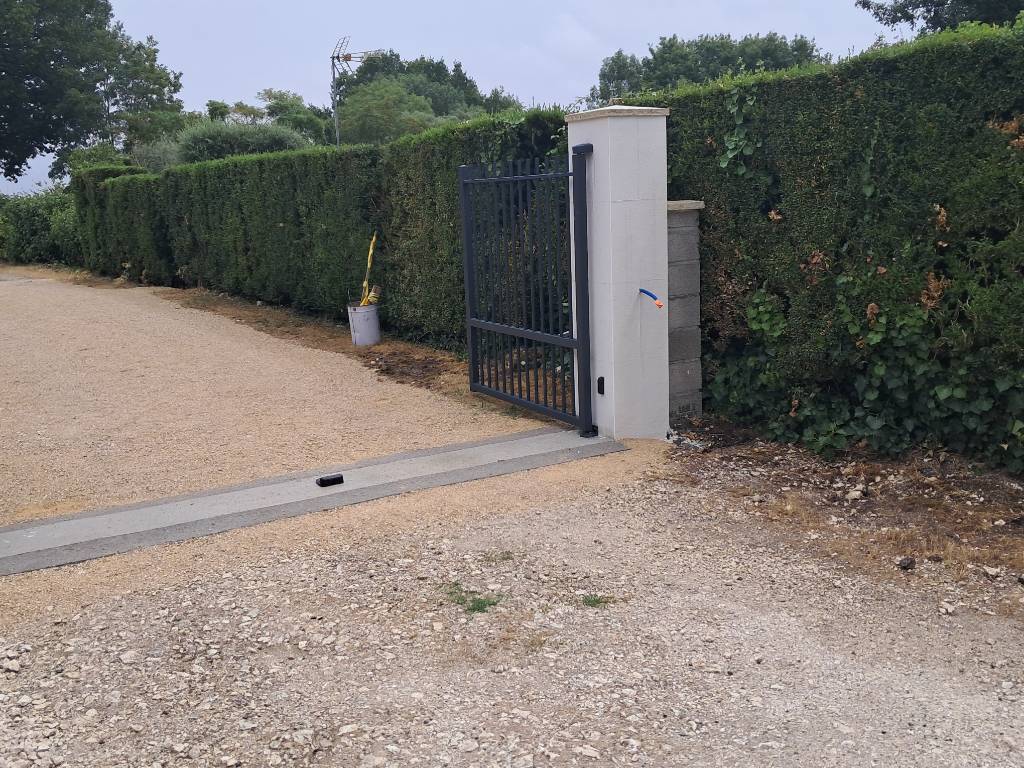 Pour améliorer le confort au quotidien, le portail est équipé d’une motorisation pour portail battant BENINCA, adaptée aux portails aluminium à deux vantaux, permettant une ouverture fluide et sécurisée.