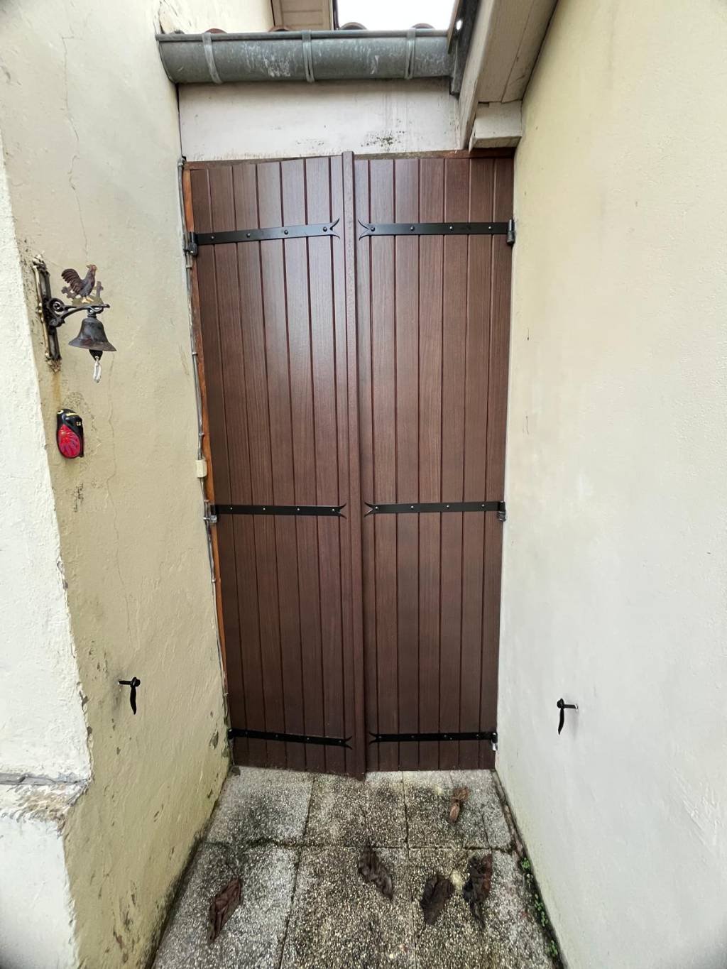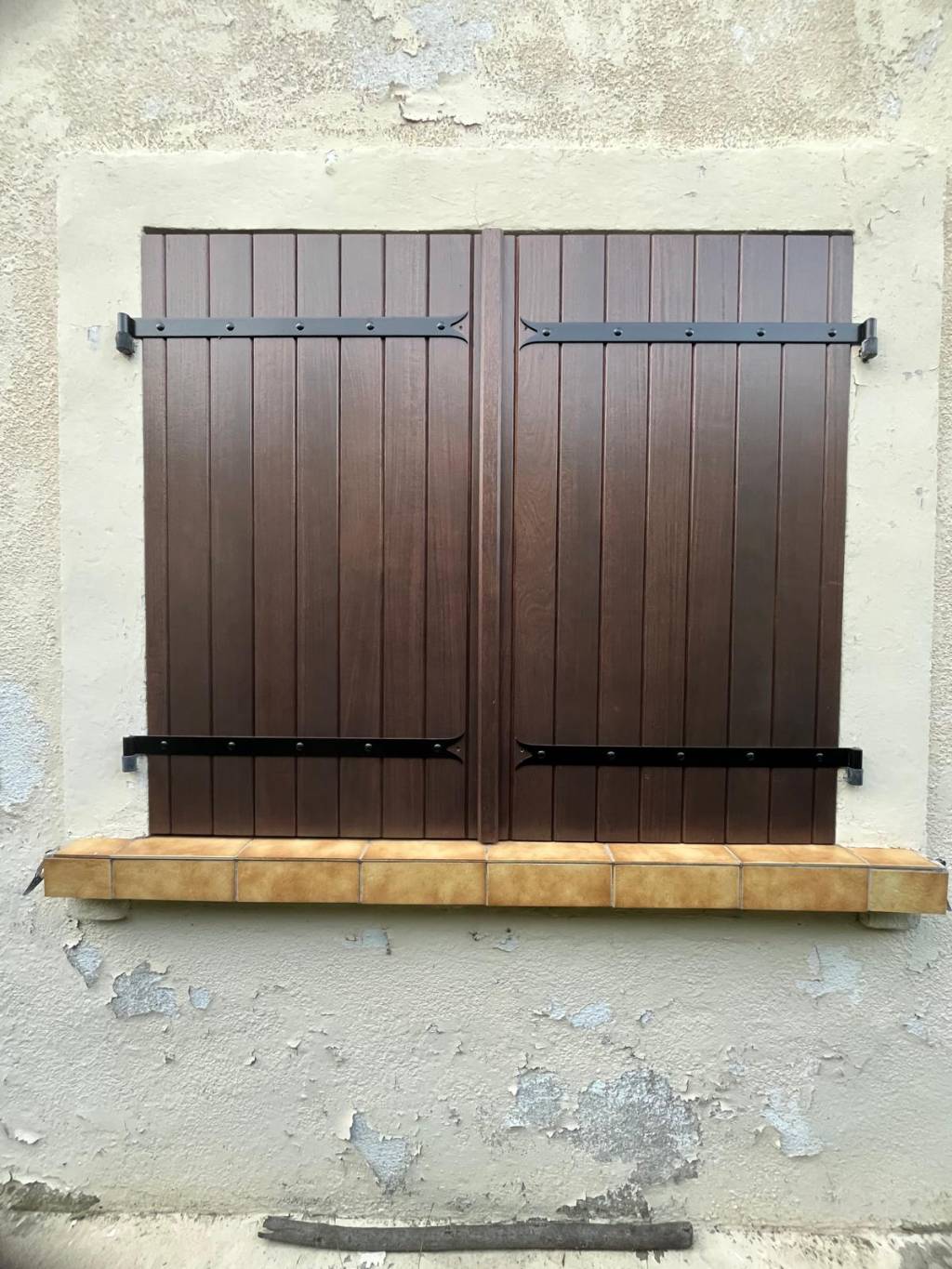 Les volets présentent un aspect traditionnel à lames verticales avec barres et écharpes, renforçant le caractère de la façade. Ils ont bénéficié d’un traitement de protection sur les deux faces, suivi d’une finition lasurée teinte châtaignier, assurant à la fois protection et esthétique.