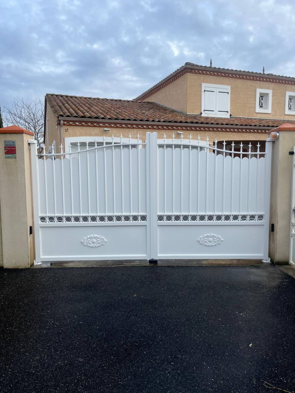 Le portail installé est un modèle aluminium à deux vantaux égaux, au design élégant et intemporel. Sa finition blanche apporte une touche de luminosité et s’intègre harmonieusement à l’environnement extérieur de la maison. Son style travaillé, avec des décors discrets répartis sur les différentes parties du portail, permet d’allier esthétique et sobriété. La partie basse pleine préserve l’intimité, tandis que les éléments décoratifs supérieurs donnent du caractère à l’ensemble.