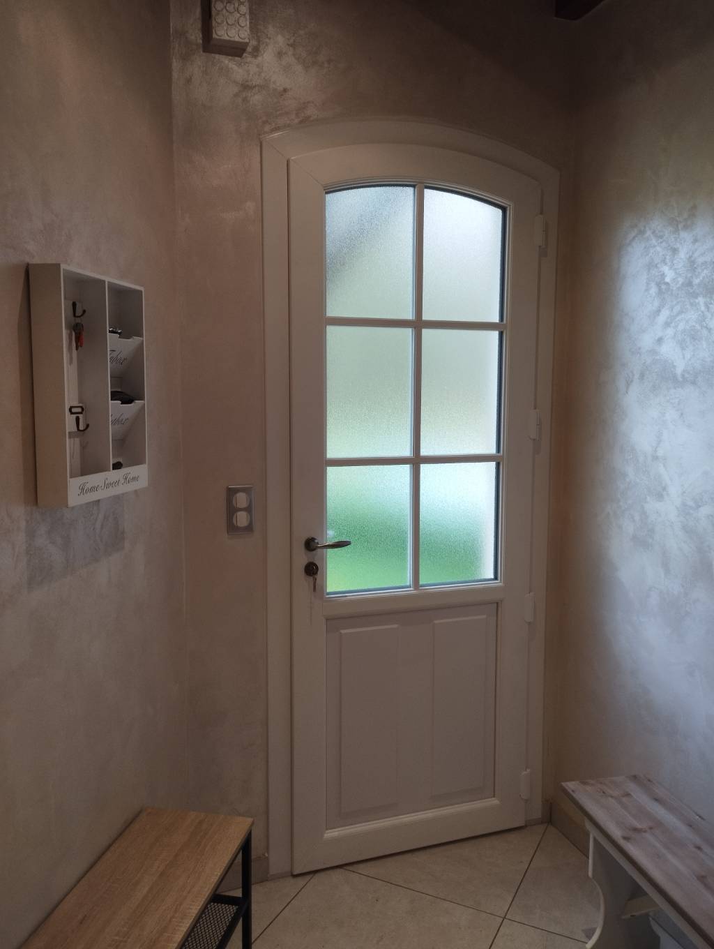 Le vitrage feuilleté 44.2, associé au vitrage décoratif imprimé 200 avec petits-bois en applique (6 carreaux), offre une excellente sécurité, une belle luminosité naturelle et une protection de l’intimité.