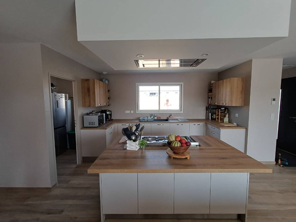 Nous avons orienté la conception vers un îlot central intégrant un piano de cuisson. Cette implantation permet de placer la zone de cuisson au cœur de l’espace, facilitant l’accès aux plans de travail, aux rangements et aux autres zones techniques.