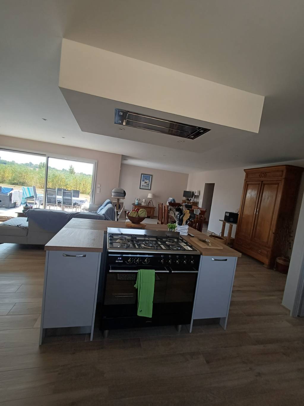 Cette solution permet de répondre aux contraintes techniques liées à un piano de cuisson tout en maintenant une implantation centrale.