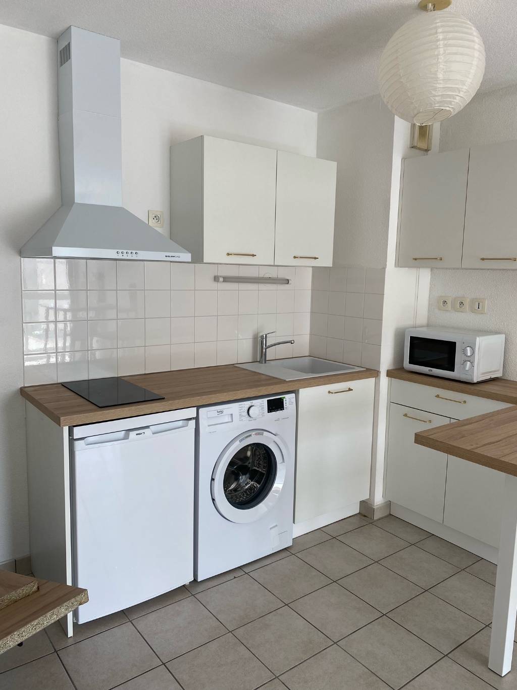 Cette cuisine se distingue par une implantation compacte et optimisée, idéale pour un appartement de petite ou moyenne surface. Les meubles de teinte claire apportent luminosité et sobriété, tandis que le plan de travail effet bois crée un contraste chaleureux et moderne.