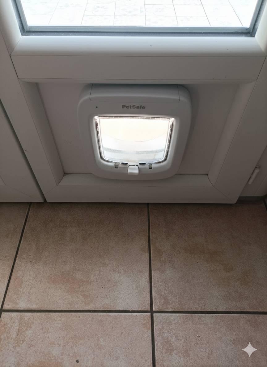 Le point fort de cette réalisation réside dans l'adaptation spécifique du soubassement. Une chatière électronique PetSafe avait été intégrée directement dans le panneau plein isolé.