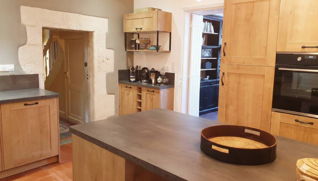 Le résultat : Une ouverture totale qui libère l'espace. Le mariage entre les façades bois du fabricant YOU et les plans de travail foncés crée un contraste élégant. L’élément central de la rénovation reste cet encadrement en pierre de taille, véritable joyau historique, désormais sublimé par une palette de couleurs sobres et naturelles.