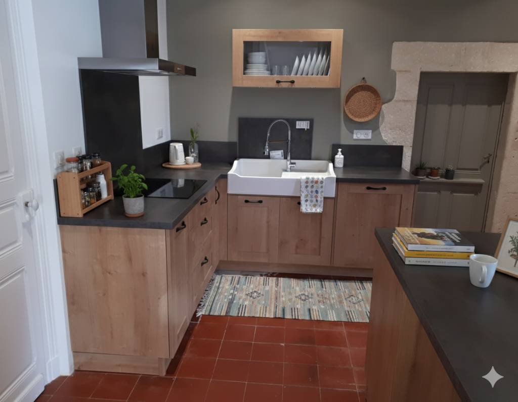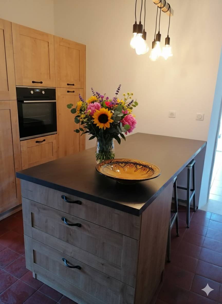 L'ajout de l'îlot central a radicalement changé la dynamique de la pièce. Il ne sert plus seulement à préparer les repas, mais devient le point de rencontre de la maison, alliant rangement, surface de travail et convivialité. L’évier timbre d’office et l’électroménager parfaitement intégré finissent de donner à cet ensemble ce look "campagne chic" tant recherché.