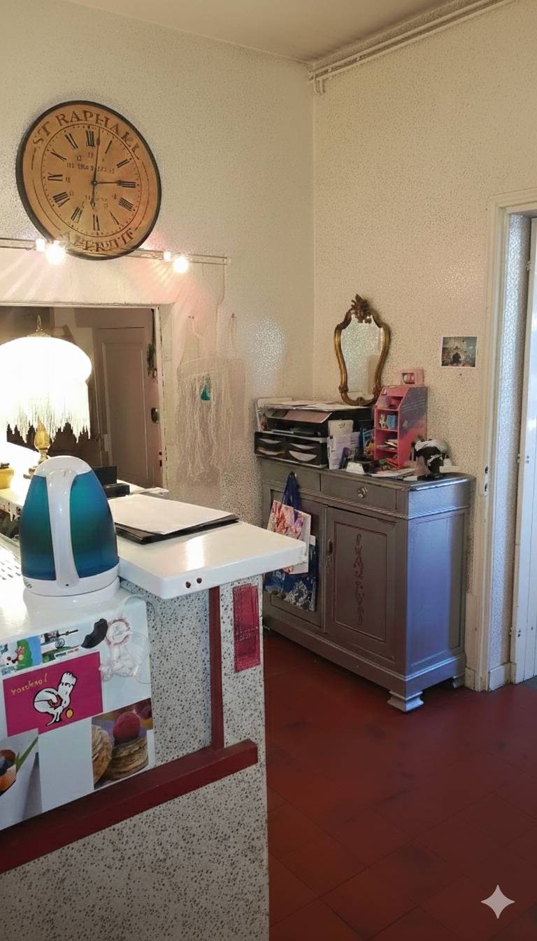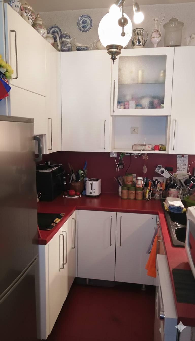 Le point de départ : Une cuisine autrefois cloisonnée, marquée par des teintes rouges et un agencement qui ne mettait pas en valeur les superbes volumes de la bâtisse.