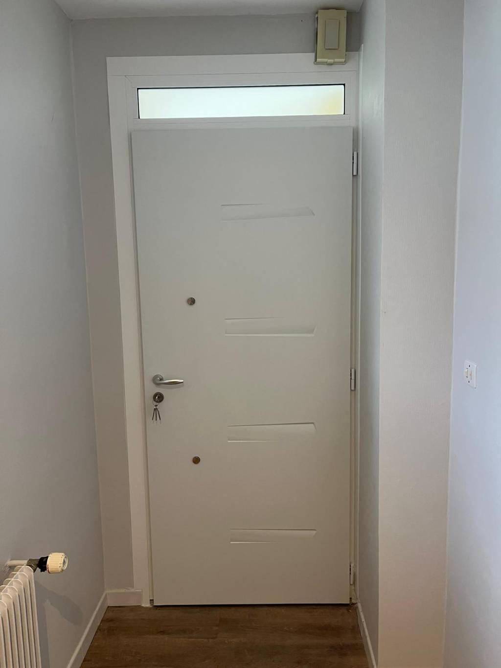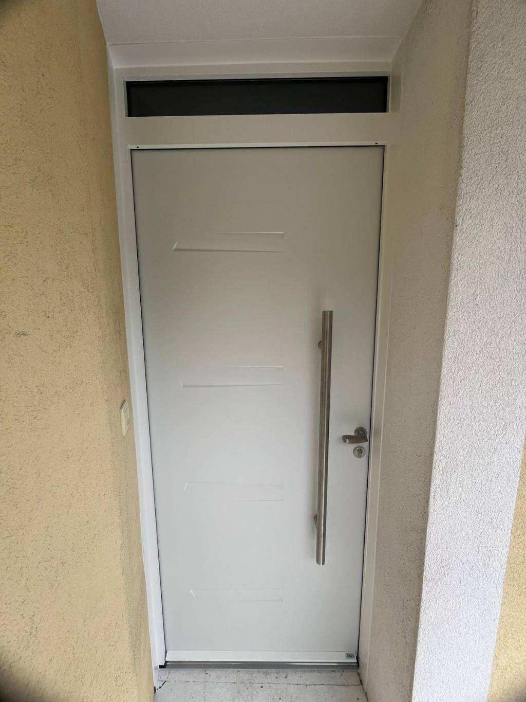 Cette porte se compose d’un vantail plein associé à une imposte fixe vitrée positionnée en partie haute. Cette configuration permet de laisser entrer la lumière naturelle dans le hall d’entrée tout en conservant l’intimité grâce à un vitrage sablé. Le rendu est à la fois élégant et fonctionnel, idéal pour valoriser la façade.