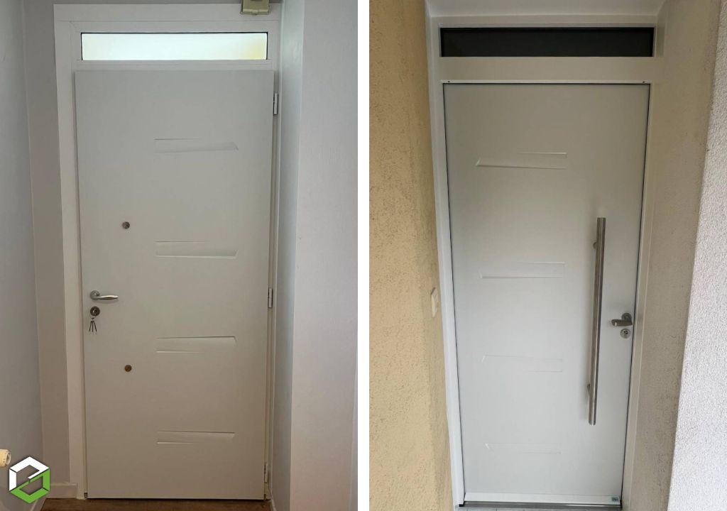 La porte a été posée en applique, avec un dormant adapté garantissant une installation solide et durable. Un seuil aluminium extra-plat, conforme aux normes PMR, assure un passage confortable au quotidien tout en maintenant une bonne étanchéité. Les finitions intérieures et extérieures ont été réalisées à l’aide de cornières, offrant un résultat soigné et harmonieux.