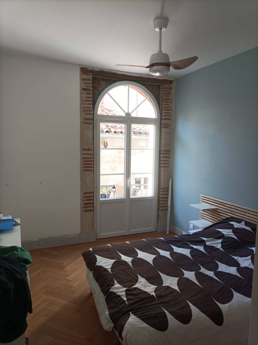 Le vitrage est un double vitrage 4/20/4 à faible émissivité avec gaz Argon (Ug = 1,1 W/m².K), avec intercalaire aluminium noir. Les vitrages reçoivent des petits bois collés avec intercalaire fictif 24/10, comprenant deux petits bois horizontaux par vitrage. L’ensemble est complété par une imposte fixe cintrée comportant trois petits bois intégrés dans le vitrage.