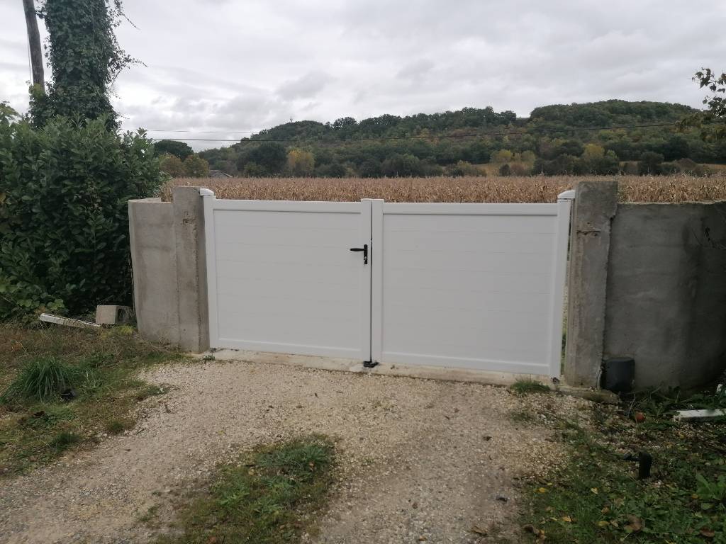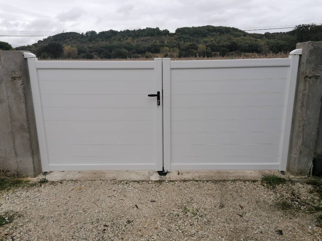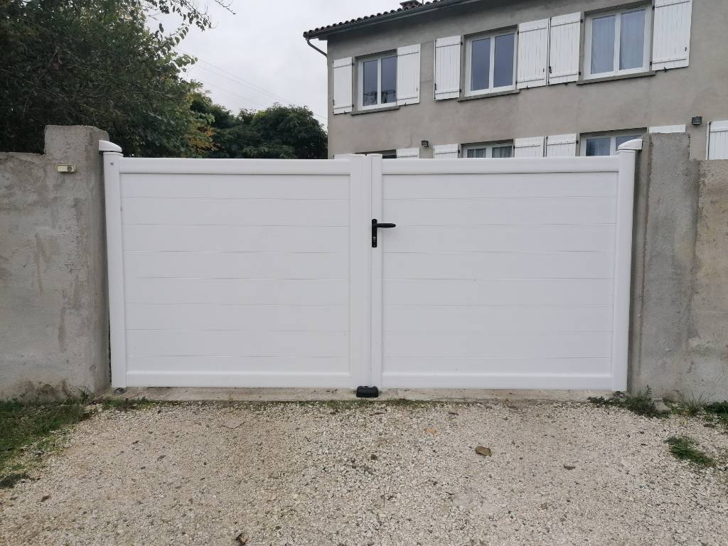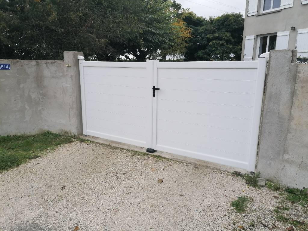 L'ouverture à 90° (droite poussant) a été ajustée avec précision pour optimiser l'accès à la propriété. Le choix du PVC blanc permet de conserver une façade lumineuse et impeccable année après année, sans jamais nécessiter de mise en peinture.