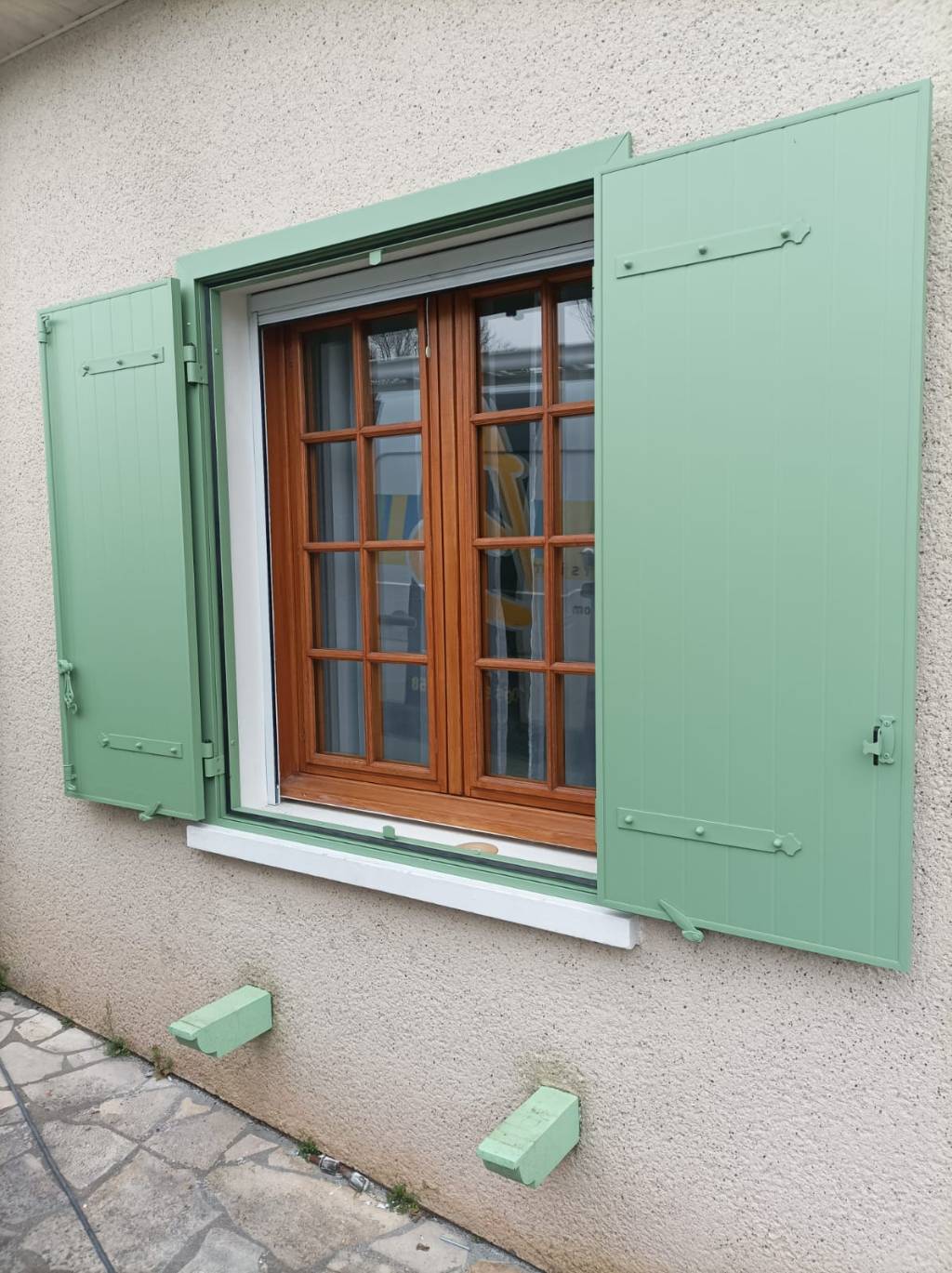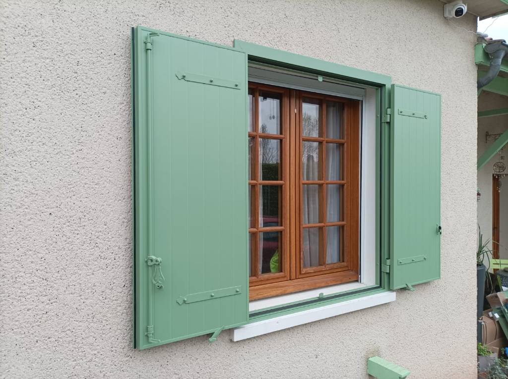 - Esthétique Impeccable : Le précadre permet de masquer proprement les anciens gonds et les éventuels éclats de maçonnerie. Il est laqué au même coloris Vert RAL 6021 texturé que le volet pour une intégration parfaite sur la façade.
