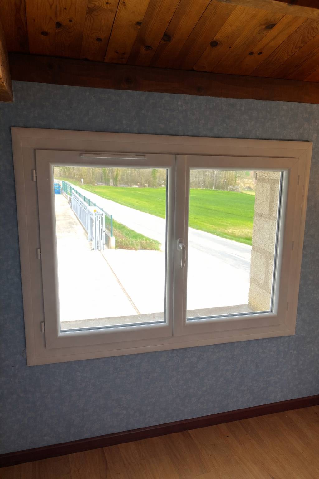 Les menuiseries sont réalisées en PVC blanc 9016, aussi bien à l’intérieur qu’à l’extérieur, offrant un rendu sobre et lumineux qui s’intègre parfaitement à l’habitation. Les finitions comprennent des parecloses design ainsi que des cornières d’habillage 40 x 60 mm sur trois côtés, complétées par une cornière 100 x 100 mm pan coupé, assurant une finition soignée après la pose.