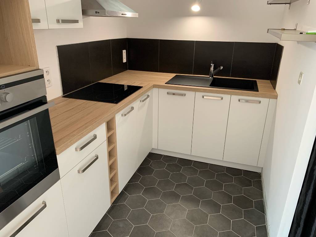- Espace de travail fonctionnel : Le plan de travail se prolonge généreusement pour offrir une surface de préparation confortable, parfaitement éclairée par des spots intégrés sous les meubles hauts.