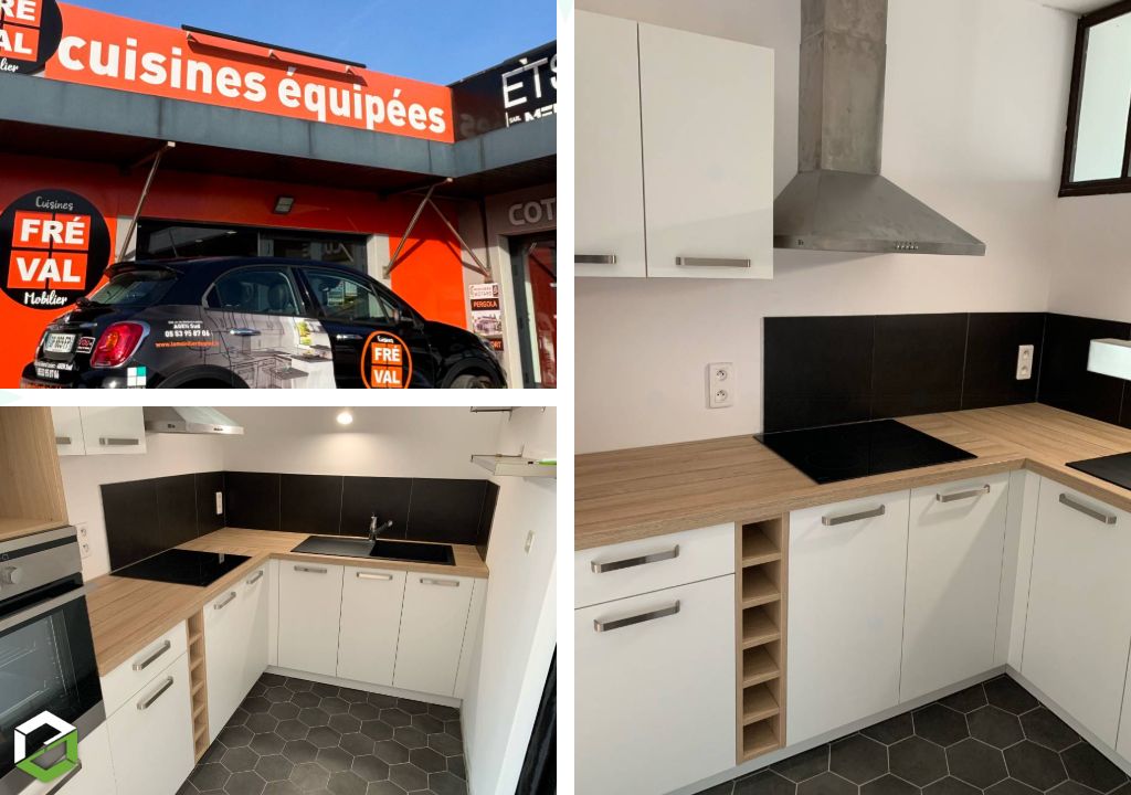 - L’alliance du Noir Mat et du Bois : Les façades sombres au toucher soyeux contrastent magnifiquement avec un plan de travail en chêne clair, apportant un équilibre parfait entre style industriel et chaleur naturelle.