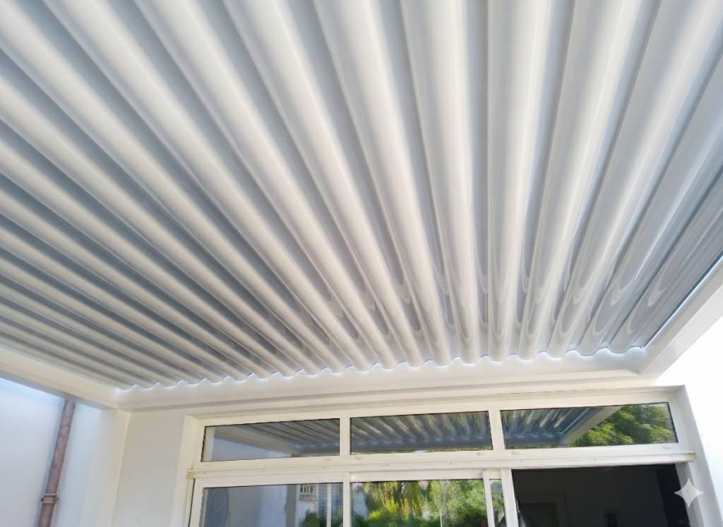 La structure est composée de 22 lames sinusoïdales en Blanc 9016 Satiné, offrant un contraste subtil et raffiné tout en assurant une excellente réflexion thermique. Ces lames perpendiculaires, orientables, permettent à notre client de jouer avec la luminosité naturelle pour créer l’ombre portée idéale ou, au contraire, maximiser l’ensoleillement de son intérieur.