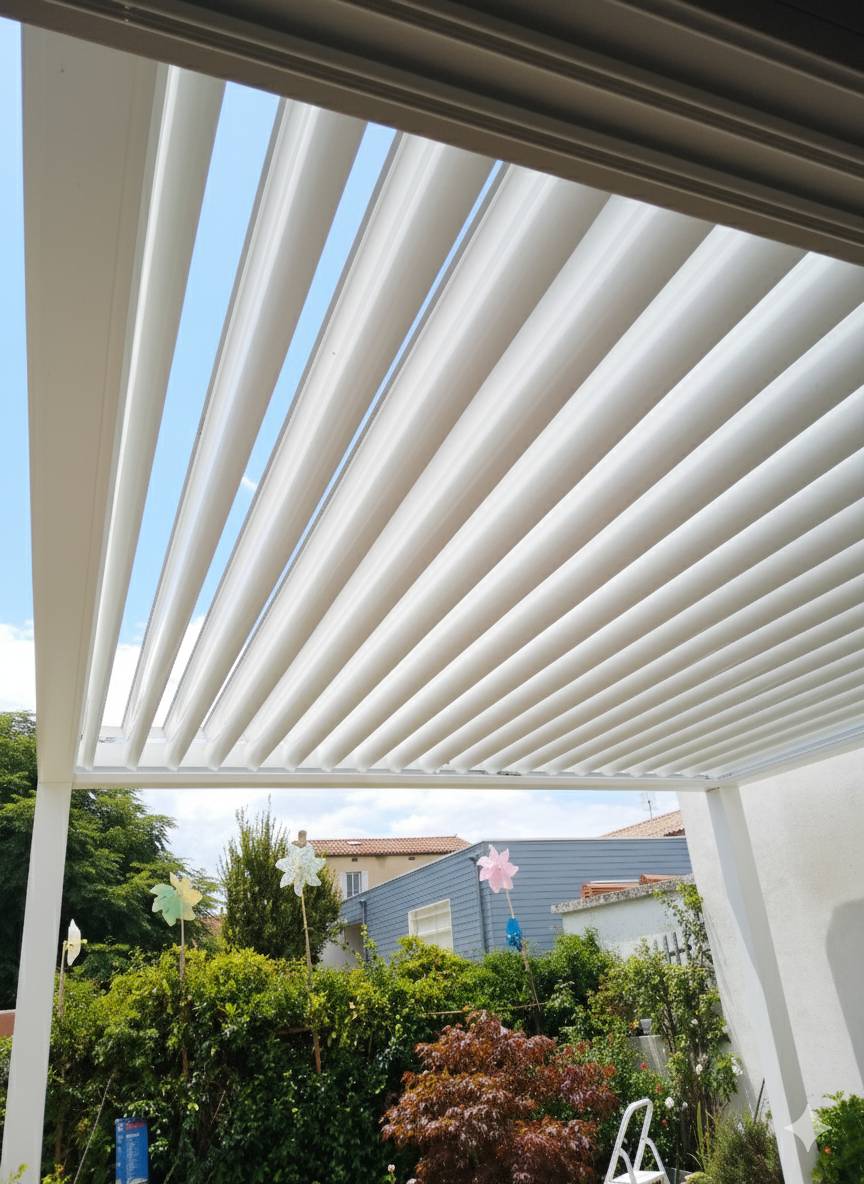 Cette réalisation souligne l'intérêt de la pergola bioclimatique : elle ne se contente pas de couvrir, elle régule naturellement la température sous la structure grâce à la ventilation naturelle générée par l'orientation des lames.