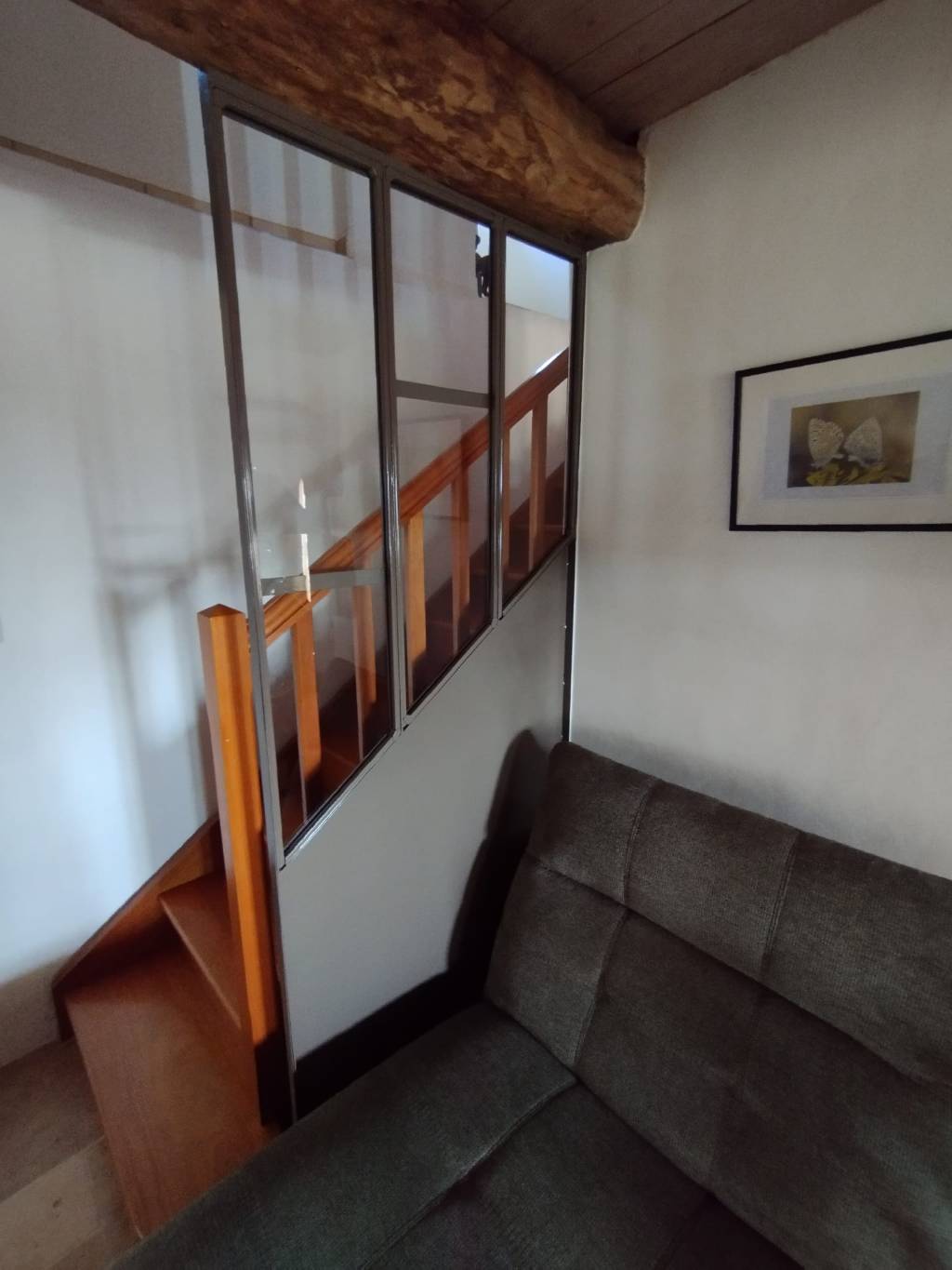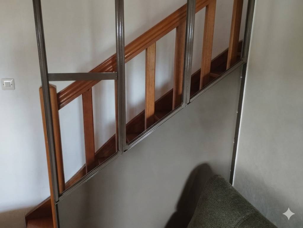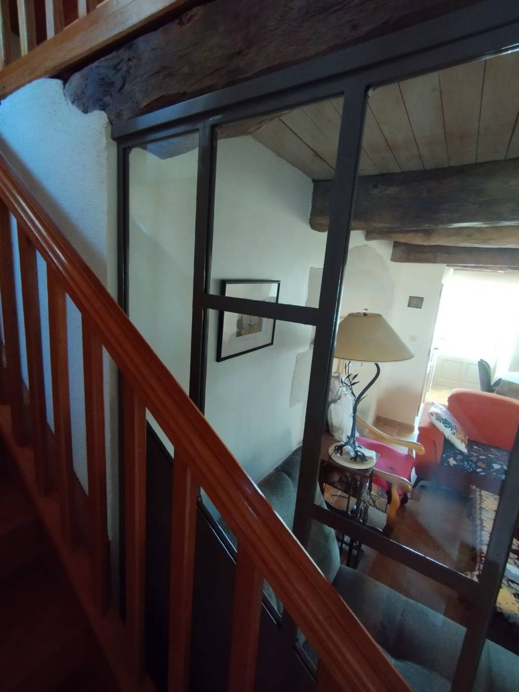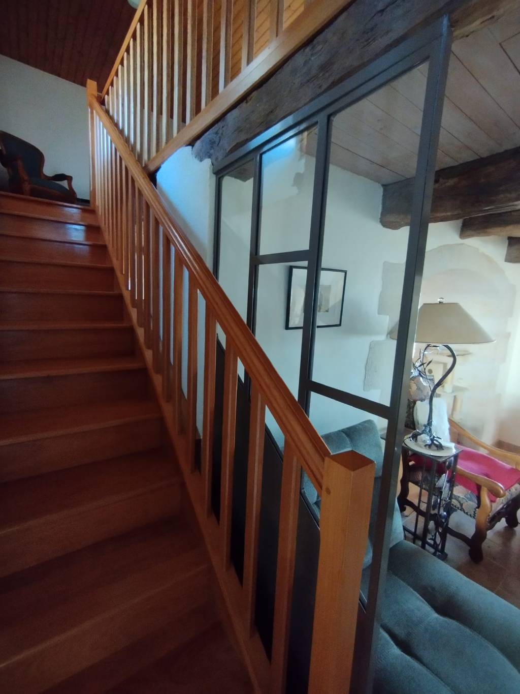 Nos clientes souhaitaient créer une vraie séparation entre leur cage d'escalier et leur salon, sans pour autant fermer l'espace ni bloquer la lumière. Dans cette belle maison ancienne avec ses poutres apparentes et son escalier en bois, il fallait une solution qui allie caractère, modernité et transparence. 🪵✨